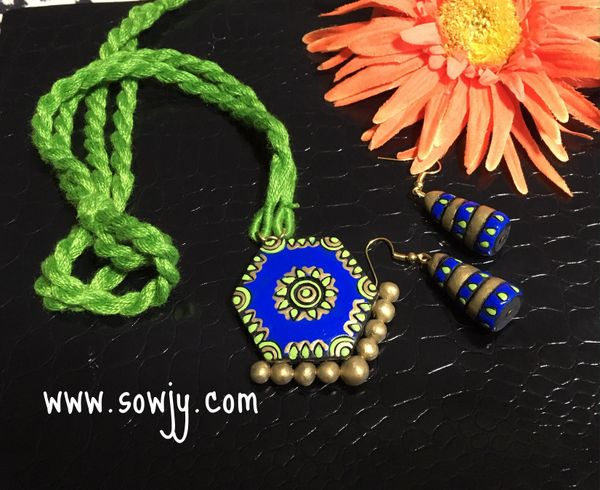 Hexagon Shaped terracotta pendant in Long rope with hanging Jhumkas Dark Blue and Green Shades Very well made.