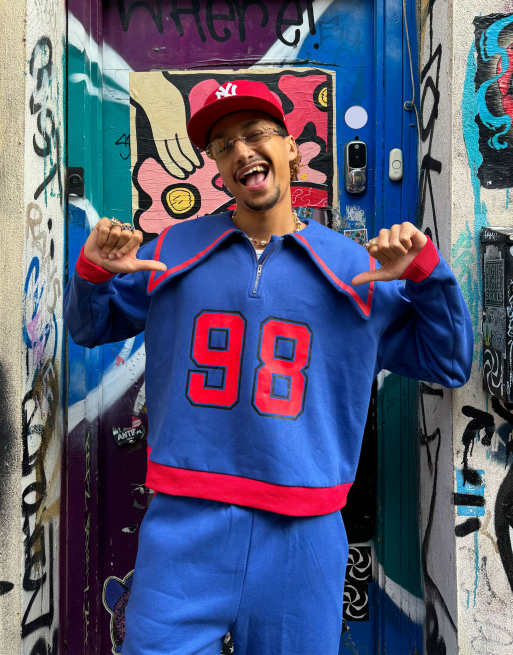Labelrail x OliBrom dramatic collar quarter zip sweatshirt in blue and red co ord Very well made.